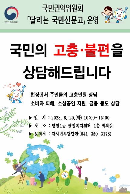 [제주교통복지신문 김강석 기자] 당진시가 국민권익위원회와 함께 오는 20일 오전 10시부터 오후 3시까지 당진1동 행정복지센터 1층 회의실에서 ‘달리는 국민신문고’를 운영한다.
