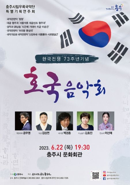 [제주교통복지신문 김강석 기자] 충주시립우륵국악단은 특별기획 ‘한국전쟁 73주년 기념 호국음악회’를 오는 22일 오후 7시 30분에 충주시문화회관에서 선보인다.