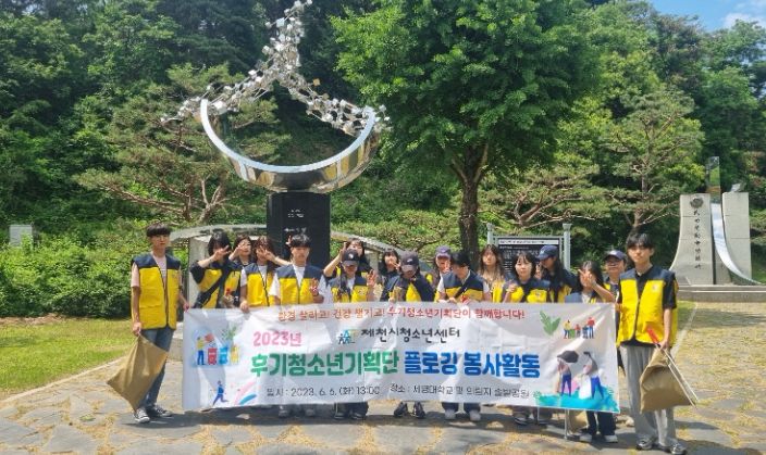 [제주교통복지신문 김강석 기자] 제천시청소년센터 소속 후기청소년기획단‘리본’이 지난 6일 호국보훈의 달을 맞아 세명대학교 및 의림지 충혼탑 주변에서 플로깅 봉사를 실시했다.