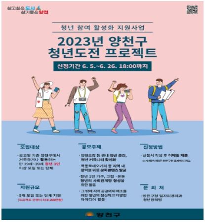 [제주교통복지신문 김강석 기자] 양천구는 청년의 참신하고 다양한 아이디어를 지원해 지역사회 발전과 건강한 청년 커뮤니티 형성에 기여하는 ‘2023 양천 청년 도전 프로젝트’를 추진하고, 이달 26일까지 참여할 5팀을 모집한다고 밝혔다.