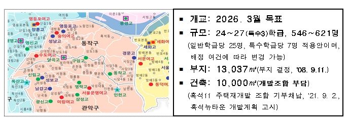 이에, 서울특별시교육청은 2022년 12월 대단위 개발로 학교 설립이 필요한 지역에 학생을 적기 수용할 수 있는 배치 효율화 방안을 수립하고, 중앙정부(국토부·교육부) 관계법령 유권해석을 통해 공립학교용지의 소유주체에 대한 논의를 종결하고 16년 간 장기 숙원 과제였던 흑석뉴타운 내 학교설립 현안을 해결할 수 있게 됐다.