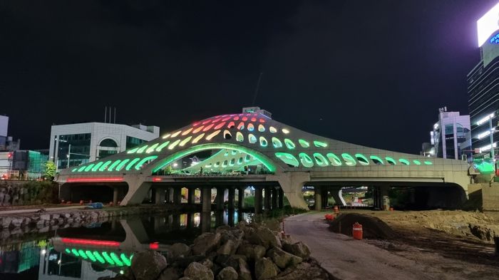 개선사업에는 ▲교량 상징조형물 및 배면·교각 이미지 연출(LED 1,320등) ▲상징조형물 내부 은하수 조명 12등 ▲기상전광판 4개 ▲상부 써치라이트(레이저빔 500w) 1개 등이 투입됐다.