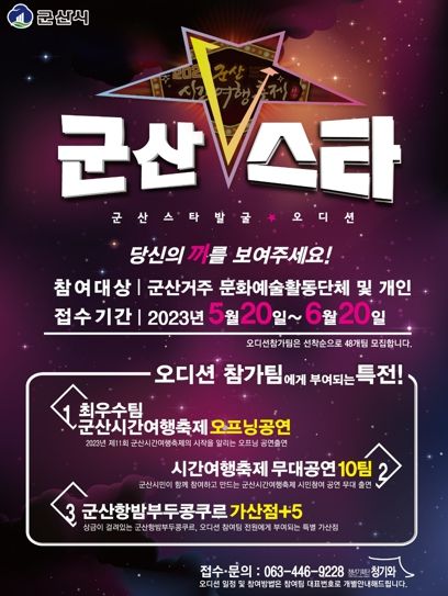 [제주교통복지신문 김강석 기자] 군산시는 2023 군산시간여행축제 시민참여공연팀(군산스타) 선발을 위한 오디션 방식의 공연을 6월 한달 간 진행한다.