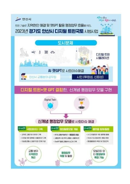 [제주교통복지신문 김강석 기자] 안산시는 최신 첨단기술(디지털 트윈, 챗GPT)을 이용하여 교통문제 해소와 교통행정 효율화를 위해 국토교통부 주관 “디지털 트윈 국토 시범사업” 공모에 참여한다고 7일 밝혔다.