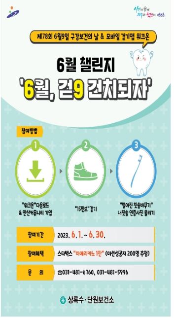 이벤트는 스마트폰 어플(워크온)을 이용한 ‘6월 걷9 건치되자’ 걷기챌린지와 이음카페(시청, 단원보건소, 중앙도서관 내)에서 음료구입 후 컵홀더에 있는 QR코드를 이용한 카카오톡채널 친구추가 및 구강건강관리 영상 시청 등을 운영하며, 참여자에게는 홍보물품도 증정한다.