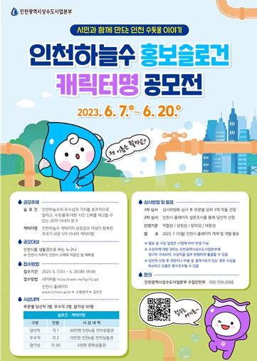 슬로건은 인천하늘수의 우수성과 가치를 효과적으로 알리고 친환경 수돗물 사용문화를 확산하는 20자 이내의 문구를, 캐릭터 명은 새롭게 단장한 인천하늘수 캐릭터의 상징성과 개성을 함축하는 5자 이내의 이름을 제출하면 된다.