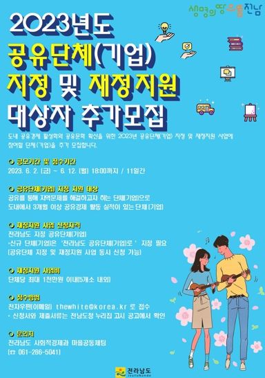 [제주교통복지신문 김강석 기자] 전라남도는 공유경제 활성화와 공유문화 확산을 위한 ‘2023년 공유단체(기업) 지정 및 재정지원 사업’ 참여 단체를 오는 12일까지 추가 모집한다고 밝혔다.