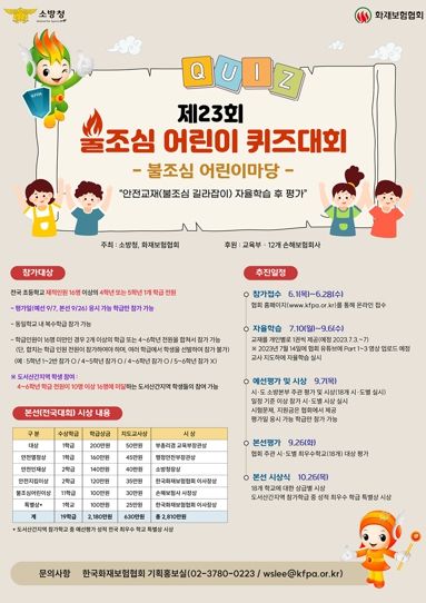 참가 접수는 화재보험협회 홈페이지에서' 온라인으로 신청할 수 있으며, 충남(예선)에서 평가를 최우수로 받은 1개 학급은 충남 대표로 전국 대회에 참여할 기회를 얻게 된다.