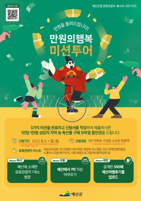 군 관계자는 “‘만원의 행복’ 미션투어를 통해 예산을 방문하는 방문객이 지역의 다양한 관광명소를 즐기고 추억을 쌓는데 도움이 되길 바란다”며 “예산의 유료 관광지, 숙박시설 활성화 및 지역경제와 관광 업계에 도움이 될 수 있도록 여행객 여러분의 많은 관심과 참여를 바란다”고 당부했다.