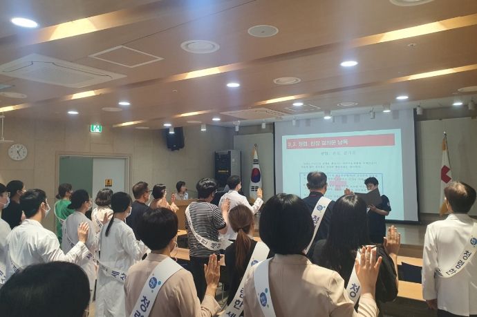이날 행사는 영주적십자병원 전직원이 참여해 다함께 청렴·친절 결의문 낭독과 청렴 슬로건인 ‘청렴은 디딤돌! 부패는 걸림돌!!’을 외치면서 청렴을 디딤돌 삼아 행복한 사회를 만들어 가는 것에 영주적십자병원이 앞장서겠다는 의지를 고취시켰다.