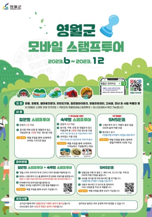 정대권 문화관광체육과장은 “관광지와 숙박, 음식점 그리고 SNS를 연계한 이번 모바일 스탬프 투어를 통해 시내 유입 유도로 관광 및 지역경제 활성화에 도움이 될 것으로 기대한다.”라며 “영월을 방문하는 관광객들이 영월의 다양한 관광지를 찾아가고 재미와 선물도 얻어가길 바란다.”라고 말했다.
