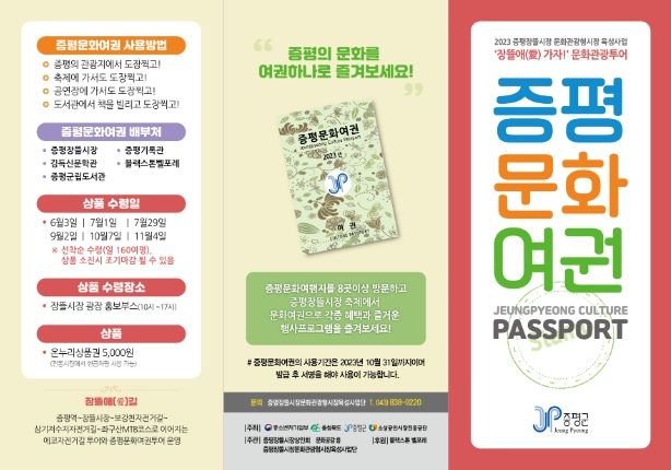 문화관광투어는 증평문화여권을 들고 가족과 함께, 또는 친구와 함께, 증평의 문화여행지를 여행해 보는 프로그램으로 증평지역 내 17곳의 문화여행지 중 8곳을 방문하여 관광 스탬프를 찍고, 매월 시행하는 장뜰시장 축제장을 방문하면 선물도 받고, 체험도 할 수 있다.