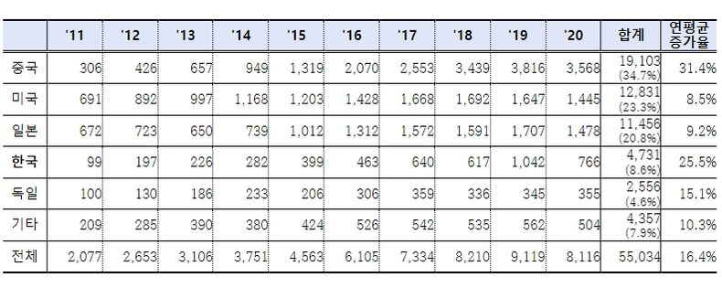 연평균 증가율도 중국(31.4%)이 가장 높았으며, 한국은 25.5%로 두 번째로 빠르게 증가했다. 일본(9.2%)과 미국(8.5%)은 평균(16.4%)보다 낮은 증가율을 보였다.