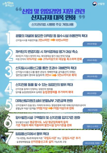이번 개정으로 산지에서의 임업경영 활동에 대한 지원도 대폭 강화된다. 산지 일시사용을 통한 조경수 재배면적을 기존 2만㎡ 미만에서 5만㎡ 미만으로 확대하고, 임산물 생산 등을 위한 산지전용이 가능한 임업인에 임야 대상 농업경영체 등록자를 추가하여 임업경영을 활성화하는 한편, 산지전용 등에 따른 대체산림자원조성비의 분할납부 허용기준액을 5억 원 이상에서 1억 원 이상으로 낮추는 등 산지규제의 합리적 운영을 위한 내용이 다수 포함됐다.