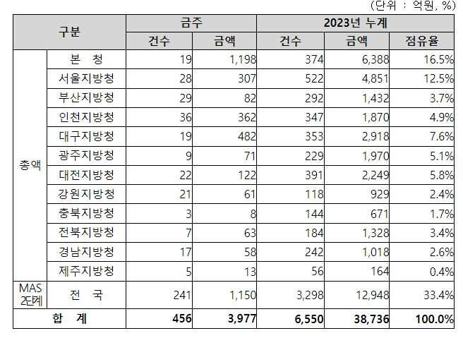 지역별 발주량을 보면, 총액계약 대상 2,827억 원 중 본청이 1,198억 원으로 42.4%를 집행하고 서울청 등 11개 지방청에서 1,629억 원을 각각 집행할 예정이다.
