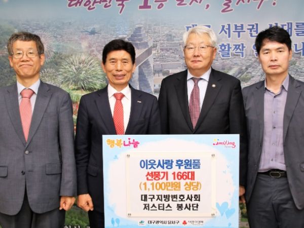 이태훈 달서구청장은 “대구지방변호사회 저스티스 봉사단의 취약계층 냉방복지 지원에 감사 드리며, 어려운 이웃들이 올 여름을 잘 이겨낼 수 있도록 소중히 전달하겠다.”고 말했다.