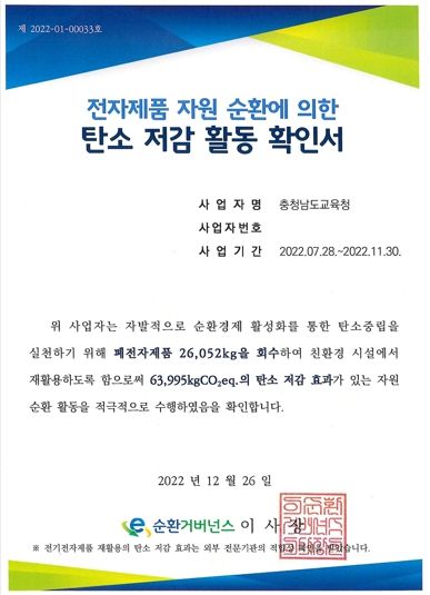 교육청에서는 작년 도내 냉난방기 교체 대상학교 30교에서 철거한 냉난방기 실내외기 874대(26,052kg)를 대상으로 E-순환거버넌스의 친환경 시설에서 재활용했으며, 그 결과 63,995kgCO₂eq.의 탄소 저감 효과(E-순환거버넌스에서 개발한 '전기전자제품 재활용의 온실가스 배출량 및 감축효과 산정방법'기준 산출)를 얻었다. 이는 소나무 458그루[CO₂ 1톤당 7.16그루/출처:국립산림과학원(‘13)]를 심는 것과 같은 탄소 저감 효과가 있다고 밝혔다.