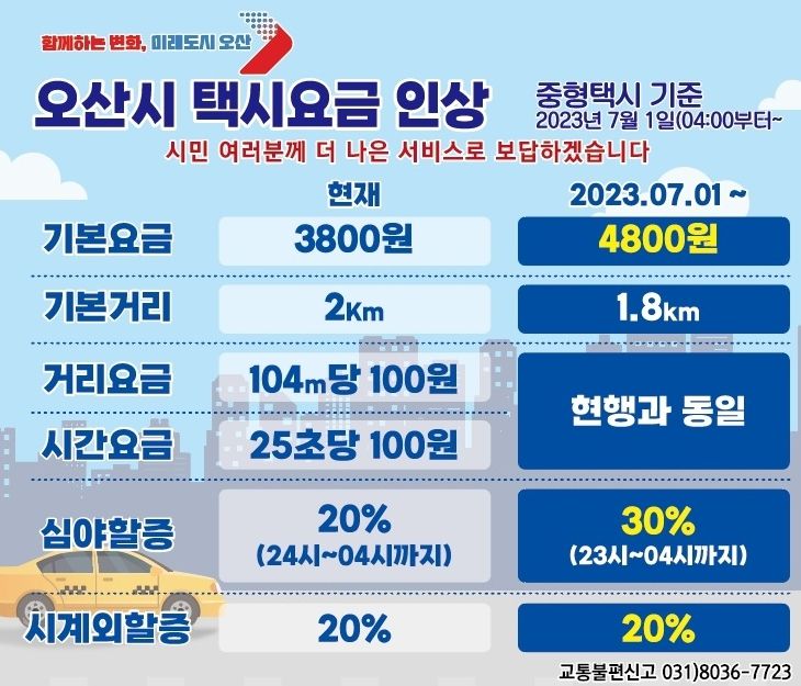[제주교통복지신문 김강석 기자] 오산시는 오는 7월 1일 새벽 4시부터 택시요금이 인상된다고 밝혔다.