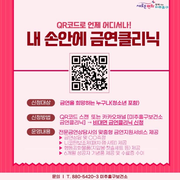 금연클리닉 미등록자는 물론 기존 등록자 누구나 상담할 수 있으며 비대면 등록을 원하는 경우 카카오톡에서 ‘미추홀구보건소 금연클리닉’을 검색하거나 포스터 상의 QR코드를 스캔 후 금연클리닉 등록신청서를 제출하면 된다.