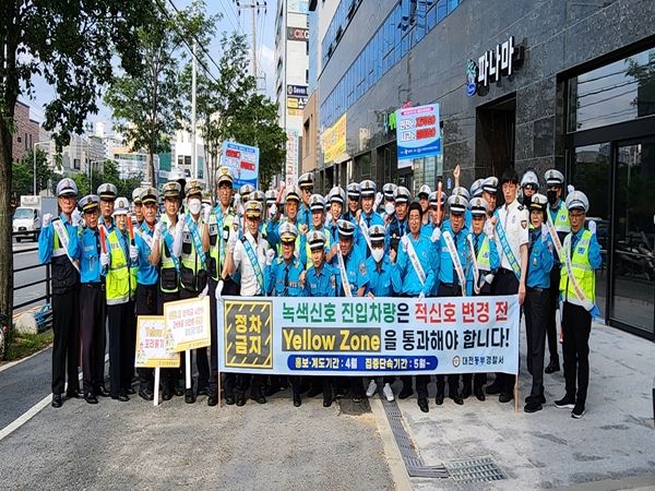 [제주교통복지신문 김강석 기자] 대전동부경찰서는 7일 오전 출근시간대 ‘옐로우 존’이 설치된 동구 판암네거리에서 교통경찰과 모범운전자 등 40여명이 꼬리물기 근절을 위한 캠페인을 실시했다