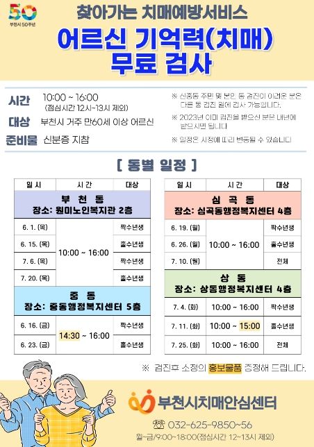 검사 후 소정의 홍보물품이 제공되며 자세한 일정은 안내문을 참고하면 된다. 이번 일정에 방문이 어려운 경우 부천시·소사·오정 3개 치매안심센터에서 상시 검사를 받을 수 있다.