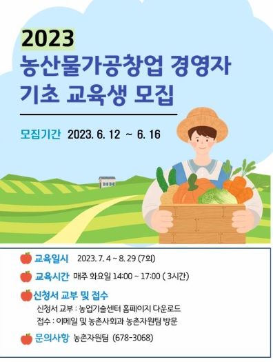 [제주교통복지신문 김강석 기자] 안성시농업기술센터는 7월 4일부터 8월 29일까지 매주 화요일 14시부터 17시까지 7회에 걸쳐 농산물가공창업 기초교육을 실시할 예정이다.