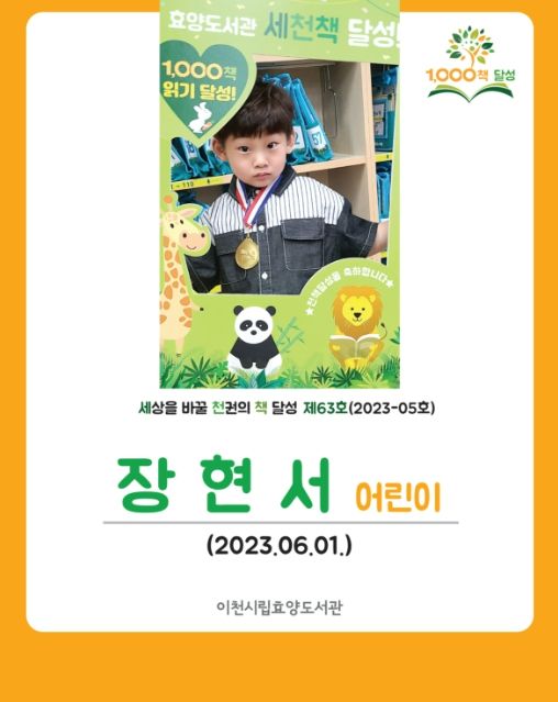 63호 천책 달성의 주인공 장현서(5세) 어린이 부모님은 “작년 동네를 구경하다가 효양도서관을 알게 됐고 자연스럽게 아들과 도서관 데이트를 시작했습니다. 5살인 아들은 아직 글은 모르지만 책을 읽어주는 엄마를 따뜻하고 부드럽다고 말해줍니다. 좋은 프로그램이 이 곳 효양도서관에 있어서 참으로 감사하고 행복합니다”며 프로그램 참여 후기를 남겨주었다.