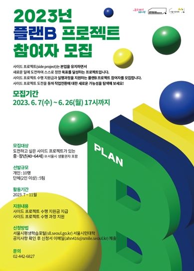 ‘플랜B 프로젝트’는 40~64세인 중장년 서울 시민 및 서울시 생활권자면 누구나 지원 가능하다. 개인 또는 단체가 달성하고 싶은 하나의 사이드 프로젝트 목표를 자유롭게 선정해 실행계획을 세워 제출하면 된다. 심사는 주제의 적절성과 프로젝트를 통한 성장과 실현 가능성을 우선해 평가한다.