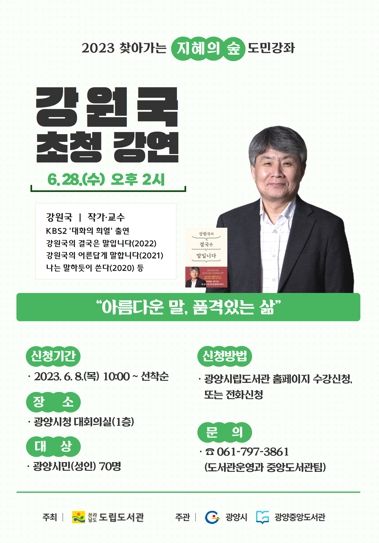 [제주교통복지신문 김강석 기자] 광양시가 오는 28일 오후 2시, 문화가 있는 날을 맞아 ‘찾아가는 지혜의 숲 도민강좌’ 강원국 초청 강연을 운영한다고 밝혔다.