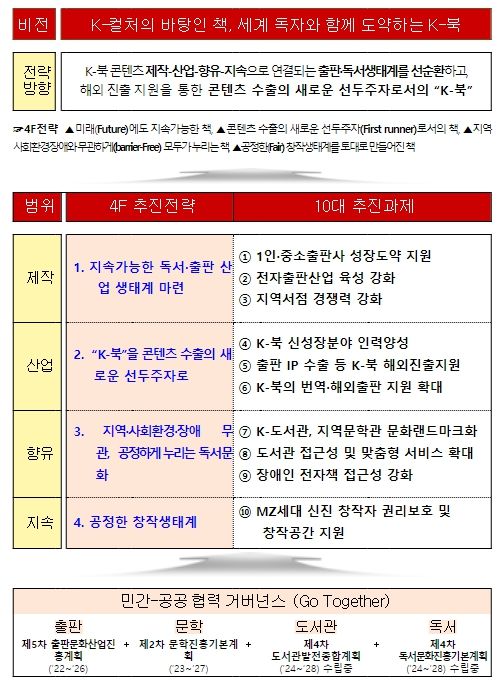 문체부는 ‘K-북 비전 선포식’의 취지를 담아 K-문학의 대도약을 위한'제2차 문학진흥기본계획」(’23~’27년)과 함께, 디지털 문해력과 MZ·알파 세대 독서 진흥 방향을 제시할 새로운 독서정책 '제4차 독서문화진흥기본계획」(’24~’28년), 국민 품으로 다가가는 K-도서관 구현을 위한 '제4차 도서관발전종합계획」(’24~’28년)을 마련할 계획이다.