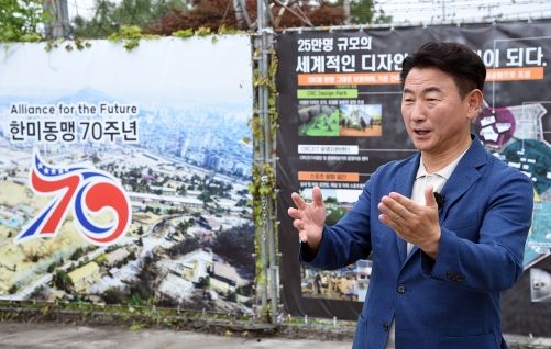 김동근 시장은 이날 그동안 굳게 닫혀있던 금단의 캠프 정문과 후문에 한미동맹 70주년을 기념하는 로고를 게시했다.