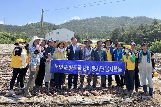 [제주교통복지신문 김강석 기자] 무안군 황토골 단비 봉사단 회원 15명은 지난 3일 오전 무안읍 매곡리 고령농가(박○○, 74세) 양파 수확 일손 돕기 봉사활동을 하고 농가 양파 사주기에도 동참했다.