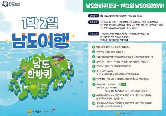 조대정 전남도 관광과장은 “남도한바퀴가 당일 여행상품만 운영해 원거리·체류형 관광객 유치에는 한계가 있었다”며 “전남 곳곳의 빼어난 관광지와 음식 등 알차게 준비한 1박 2일 상품을 통해 힐링관광 중심지로 떠오르는 전남에서 추억여행을 즐기길 바란다”고 말했다.