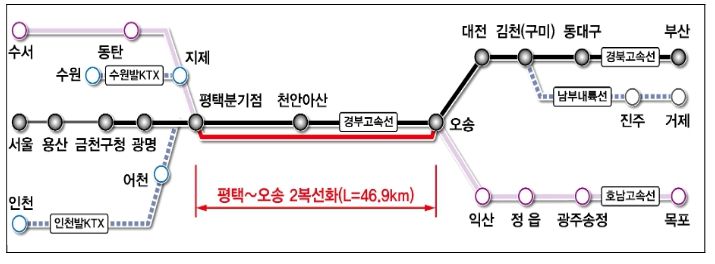 평택~오송 고속철도 2복선화 사업은 경부・호남・수서 고속철도가 만나 고속열차 운행이 집중되어 포화상태에 이른 평택~오송 구간 지하에 46.9㎞의 고속철도를 신설하는 사업으로, 5년간 약 3조 2천억원이 투입되어 '28년 개통될 예정이다.