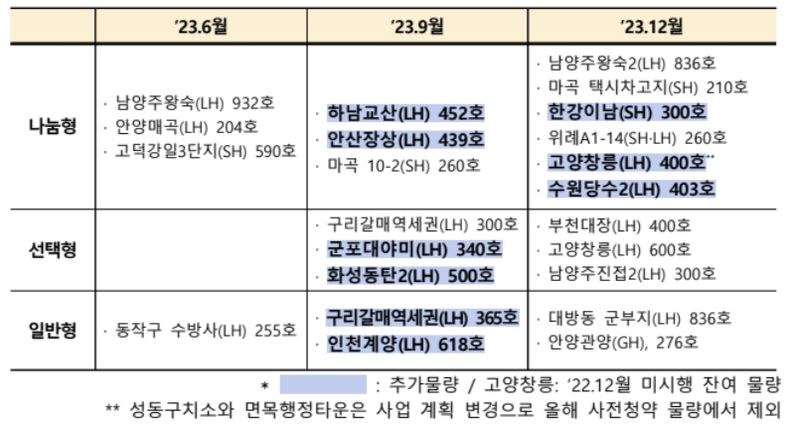 올해 시행 물량은 기존계획에서 하남교산, 화성동탄2, 인천계양, 서울 한강이남 등 9개 지구가 추가되어 총 10,076호를 공급할 예정으로, 3회에걸쳐 공급된다.