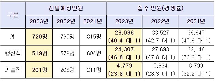 [제주교통복지신문 김강석 기자] 2023년도 국가공무원 7급 공개경쟁채용시험 경쟁률이 지난해 보다 하락한 40.4대 1로 집계됐다.