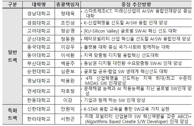 과기정통부는 올해 13개 대학(일반트랙 11개, 특화트랙 2개)을 선정하고 일반트랙 대학에는 각 9억5천만원, 특화트랙에는 각 4억7천5백만원을 지원할 예정이다.