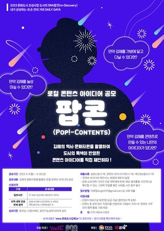 (재)김해문화재단 문화도시센터는 ‘로컬 콘텐츠 아이디어 공모 '팝콘(Pop!-Contents)'’을 6월 5일부터 30일까지 개최한다.