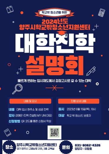 이번 설명회는 학교 밖 청소년 전문 진로 진학 컨설턴트인 강예은 MY UNI 대표를 초빙해 검정고시 이후 대학입시를 준비 중인 양주시 학교 밖 청소년들에게 필요한 대입 성공 전략 및 전형 분석 등 다양한 대입 관련 정보를 제공할 예정으로 2024학년도 대입을 준비하는 양주시 학교 밖 청소년과 보호자라면 누구나 참여할 수 있다.