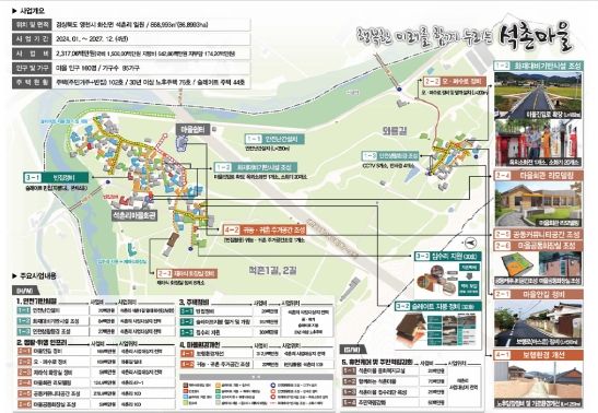 영천시는 4년 동안 총합 국·도비 29억 원을 지원받아 총 사업비 44억 원으로 슬레이트 지붕 개량과 집수리를 포함한 주택 정비와 재래식 화장실 정비, 마을회관 리모델링 등 생활·위생 인프라 확충, 그리고 주민공동체 활성화를 위해 주민학교, 동네목수 양성, 주민안전교육 등을 병행해 추진할 계획이다.