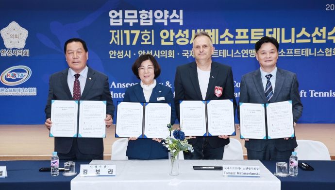[제주교통복지신문 김강석 기자] 지난 16일 ‘2024 안성세계소프트테니스선수권대회’의 성공적 개최를 위해 안성시-안성시의회-국제소프트테니스연맹-대한소프트테니스협회 간 업무협약을 체결했다.