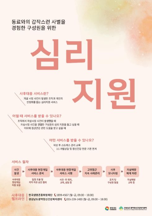 [제주교통복지신문 김강석 기자] 경상남도는 자살 등 갑작스러운 죽음으로 동료를 잃은 조직의 구성원을 대상으로 사후대응 서비스를 실시한다고 밝혔다.