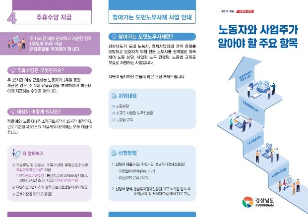 노동권익지원단이 홍보하는 노동관계법 주요 내용은 ▴ 근로계약서 서면 작성·교부 ▴임금 지급 시 임금명세서 서면 교부 ▴최저임금 준수 ▴주휴수당 지급 등 4개 항목으로, 전문가 자문을 통해 기초노동질서 중 알면서도 잘 지켜지지 않는 항목을 중점적으로 선정했다.