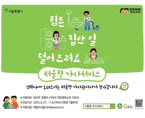 이와 관련해 서울시는 오는 6월 27일 10시부터 7월 6일까지 열흘간 ‘서울형 가사서비스’ 신청을 받는다. 서비스는 7월부터 이용할 수 있다.