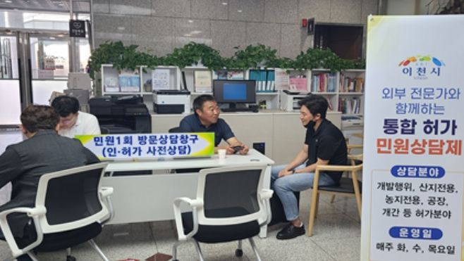 [제주교통복지신문 김강석 기자] 이천시는 주택, 개발행위, 산지, 농지, 건축등 복합민원에 대하여 인 ․ 허가 업무를 대행하고 있는 토목 ․ 건축협회 회원들이 자발적으로 순번제를 정해 매주 화⋅수⋅목 09:30 ~ 11:30까지 “전문가와 함께하는 통합 인·허가 민원상담제”를 운영하고 있다.