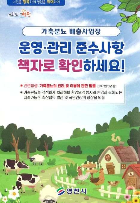 [제주교통복지신문 김강석 기자] 영천시는 악취 등 지역주민의 생활 환경피해 예방을 위해 가축사육에 필요한 준수사항을 이해하기 쉽게 제작한 가축분뇨 배출사업장 운영·관리 준수사항 리플릿 2500장을 축산농가에 배포했다고 19일 밝혔다.