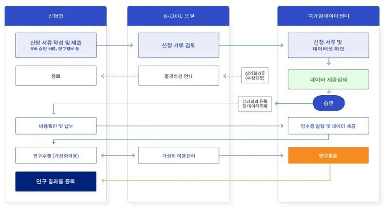 국립암센터는 K-CURE 포털을 통해 데이터 활용을 신청받고 연구목적 및 가명처리 적정성 등을 심의하며, 한국보건의료정보원은 암 공공 라이브러리 데이터를 안전하게 분석할 수 있도록 폐쇄분석 공간인 안심활용센터 연계를 지원한다.