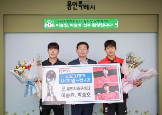 [제주교통복지신문 김강석 기자] 이상일 용인특례시장이 19일 용인시축구센터에서 프로에 진출한 ‘2023 FIFA U-20 월드컵’ 4강 주역 이승원, 박승호 선수를 만나 격려했다.