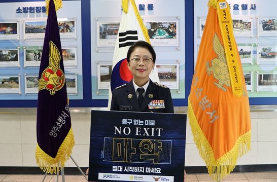 [제주교통복지신문 김강석 기자] 김선경 양주여성의용소방대 연합회장은 19일 마약 범죄 예방을 위한 ‘NO EXIT(노 엑시트)’ 캠페인에 참여했다.
