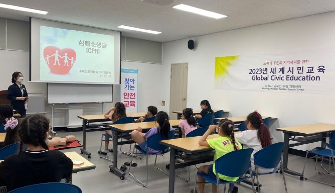 [제주교통복지신문 김강석 기자] 청주시 외국인주민 지원센터는 19일 센터1층 프로그램실에서 외국 국적 어린이 15명을 대상으로 심폐소생술 체험 및 안전교육을 실시했다.
